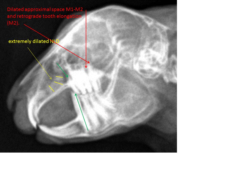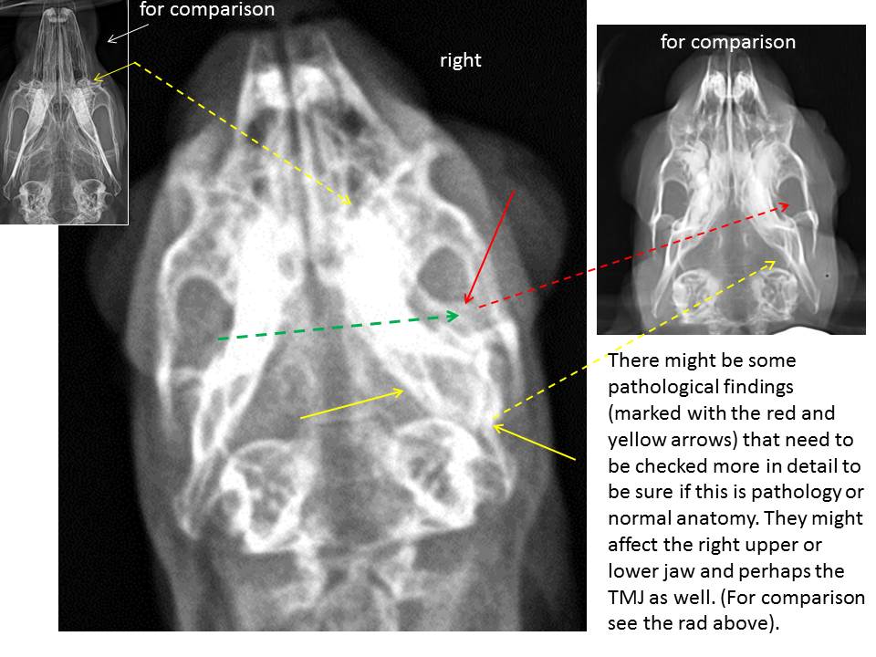 – the last but one upper cheek tooth (M2) shows an apex elongation (retrograde growth) and there is a widened approximal space M1-M2 (which side?) (red arrows). Since there is an abnormal radiodense structure visible within the caudal part of the right orbita on the dv-view (red arrow), we might be inclined to assume a retrobulbar infection or at least a retrograde elongation of the caudal cheek teeth with a possible additional tooth deviation. Albeit the dv-view is not positioned absolutely symmetrically, I think this area looks strange and therefore should be checked in more detail. The somehow „thickened“ and unphysiologically structured caudal part of the mandible (yellow arrows) might only be the result of the asymmetrical positioning? It’s really difficult to say. Dv-views can always be easier and much better interpreted, if the neck of the animal is slightly pressed down to the table. In doing so, you can also better validate the alveolus of the first maxillary cheek teeth (P2) (see the image top left for comparison). The apex/dental body of one or both (?) first upper cheek teeth appears to be abnormally short and maybe pointed ((green arrow on the lateral view). In my experience, the antagonists of similarly altered maxillary teeth tend to overgrow intraorally since they simply react to this mostly painful primary pathology of the maxillary premolar (P2). So also in this case, the first lower cheek tooth (P3) depicts an extreme elongation of its clinical crown (long green arrow) as a consequence of insufficient tooth wear due to the painful pathology of the first maxillary cheek tooth (P2) (green arrow). This is an indication for a more thorough examination of both upper premolars and the caudal molars (M1+M2). Therefore, I would inform the owner about these initial findings and recommend a more detailed dental check-up consisting of at least four standard skull views and an intraoral radiograph of the maxilla, additionally (using a flexible digital plate). Based on the new findings a targeted therapy can be planed. Since the radiodensity within the orbita can be the consequence of a primary mandibular pathology as well, I would take an intraoral radiograph of the mandibula, too. Another possible option is a CT study. It depends on the owner (costs).
