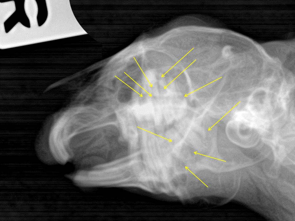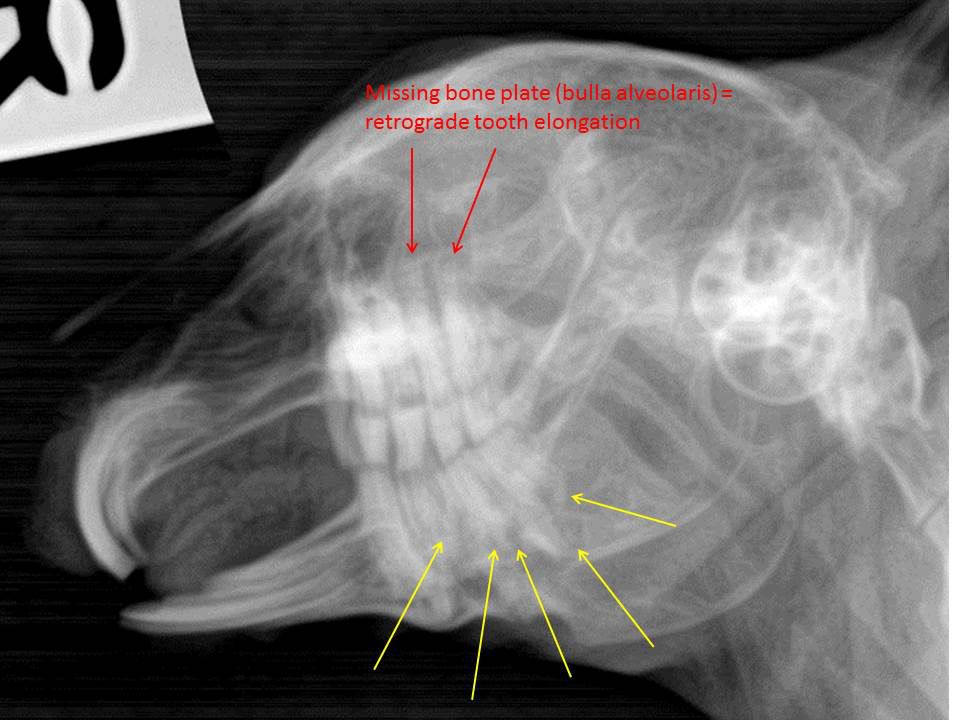 Thank you for posting the images and the rads. This rabbit has indeed a cheek tooth malocclusion – as you mentioned above. And therefore this is a secondary = acquired incisor malocclusion. The main problem are the cheek teeth and an extraction of all incisors would not „help“ this animal – it’s contraindicated, in my opinion. I tried to mark some pathological findings that need further diagnostic work-up (but unfortunately your rads are very blurry on my screen) and – if possible – more targeted therapy. Only trimming the theeth on a regular basis does not seem to be enough for this poor guy. The rabbit suffers from an advanced enamel-and dentin hypoplasia (almost all cheek teeth show an abnormal dental structure that should be visible on intraoral exam as well = pathological appearance of the occlusal plane). In addition to that, multiple teeth have signs of intradental lysis. If it’s real caries or FORL-like tooth resorption cannot be assessed based on these radiographs. You need a full set of skull-rads (four views: latero-lateral for using the reference lines, dv (neck pressed down to the table), both sides oblique (head tilted about 40 degrees) and if feasible intraoral rads. Alternatively a CT study can be recommended (this depends on the owner – costs).