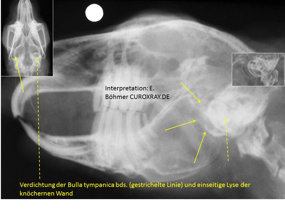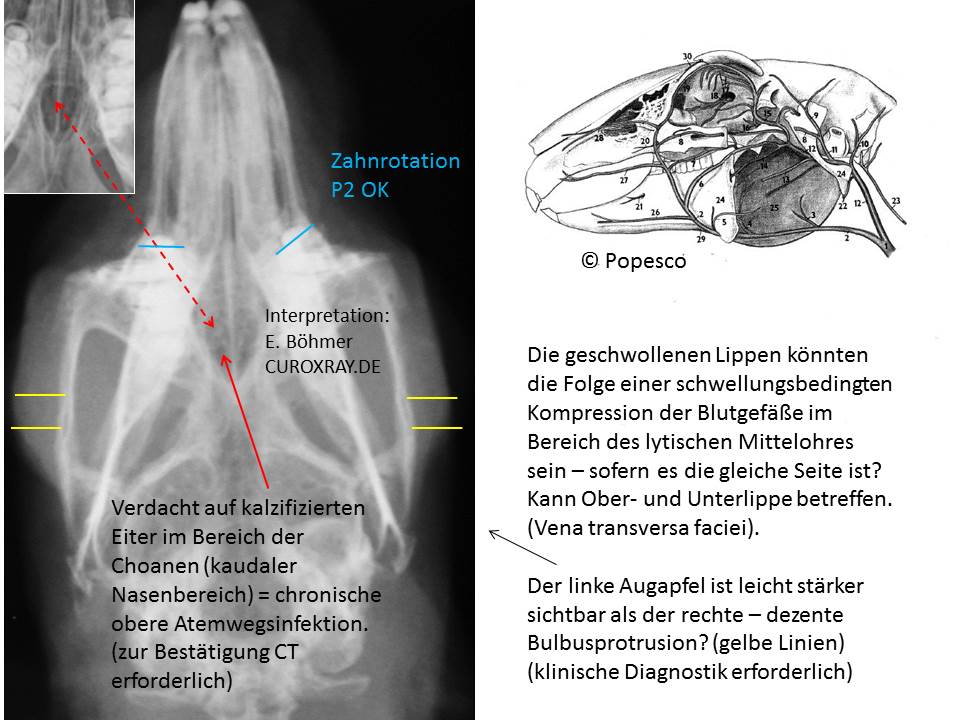 Dennoch war der Allgemeinzustand bis vor kurzem ungestört. Eine einseitige Konjunktivitis im Februar diesen Jahres besserte sich auf Behandlung mit Augentropfen. Ende März wurde sie vorgestellt, weil ihr das Futter beim Fressen wieder aus dem Maul fiel. Die Lippenwaren stark geschwollen, sodass wir zunächst eher an ein Trauma dachten. Die Fütterung erfolgt überwiegend mit frischen Kräutern (v.a. grüne Soße), dazu gibt es Heu. Aufnahme von Zimmerpflanzen oder Efeu oder anderen ungewöhnlichen Dingen haben wir anamnestisch ausgeschlossen. Die Behandlung mit Metacam erbrachte eine Besserung aber noch immer keine vollständige Normalisierung. Im Röntgen fiel mir vor allem die etwas seltsam geformten und vor allem rechts verschattete Bullae auf. Einen eindeutigen Grund für die Lippenschwellung im Ober- und Unterkiefer konnte ich nicht ausmachen, freue mich daher über Input.