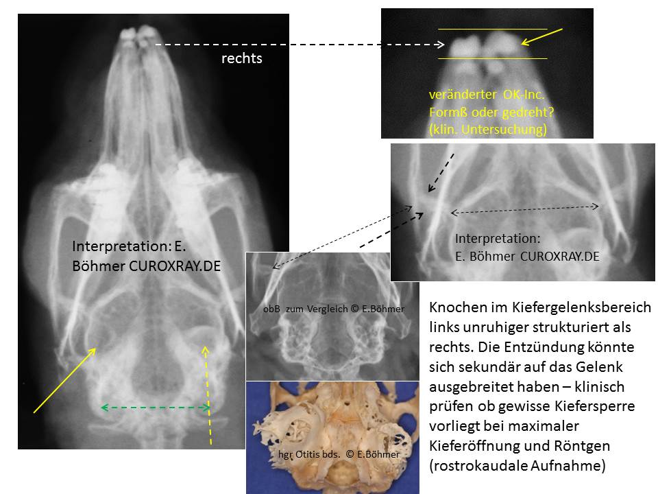 Anhand der dorsoventralen Röntgenaufnahmen (welche auf meinem Bildschirm sehr unscharf sind – auf dem Original wird es sicher besser zu erkennen sein) vermute ich eine gewisse Beteiligung des linken Kiefergelenkes (schwarze gestrichelte Pfeile). Aber dies bedarf der weiteren Abklärung. Hiermit einhergehend ist häufig eine gewisse Kiefersperre; d.h. der Fang kann nicht maximal geöffnet werden. Bei anderen Fällen verschiebt sich der Unterkiefer zunehmend zur Seite sobald man versucht den Fang passiv weit zu öffnen. Zum Vergleich in der Mitte unten das entsprechende Röntgenbild eines gesunder Kaninchens mit dementsprechend physiologischen Kiefergelenken. Darunter das Präparat eines anderen Kaninchens mit beiderseitiger Lyse der Mittelohrwand als Folge einer hochgradigen chronischen Otitis media. Desweiteren lässt die dv-Aufnahme erkennen, dass ein oberer Schneidezahn strukturell verändert und/oder intraalveolär rotiert sein muss. Eine sorgfältige klinische Untersuchung kann bei der Klärung helfen und selbstverständlich auch eine weitere röntgenologische Diagnostik in Form intraoraler Röntgen-Aufnahmen.