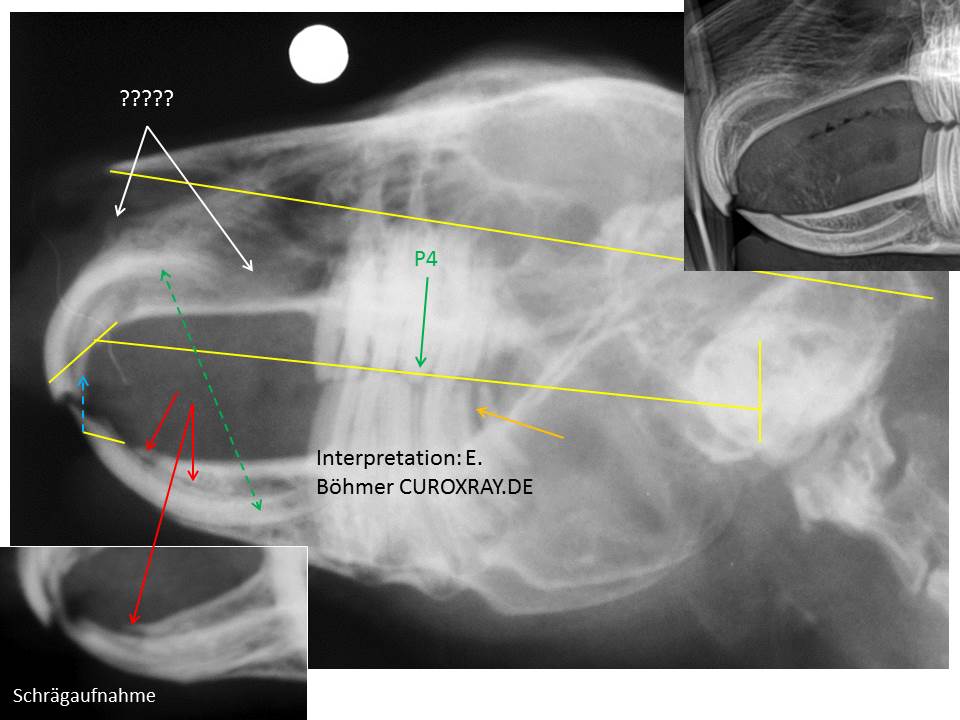 Bei diesem Patienten ist darüberhinaus auch der Tränen-Nasenkanal verdichtet (rechte weiße Linien) und das Lungenfeld infolge der chronischen Rhinitis leicht überbläht (Emphysem) (Bild des Thorax hier nicht enthalten). Die seitliche Röntgenaufnahme des Kopfes lässt im Bereich überhalb der Mitte der oberen Schneidezähne eine eigenartige Struktur erkennen (????), die mir so nicht bekannt ist. Da in diesem Bereich der Tränen-Nasenkanal in die Nasenhöhle mündet, sollte man sich diesen Bereich klinisch nochmals genauer anschauen und den Tränen-Nasenkanal auch unbedingt spülen. Auch Kontrastmittelstudien wären möglich. Hinzu kommt, dass die klinischen Kronen der Schneidezähne im Ober- und Unterkiefer deutlich zu lang sind (kurze gelbe Linien) und die extrem spitz auslaufenden unteren Inzisivi unphysiologisch mit ihren maxillären Antagonisten okkludieren = direkter Kontakt und pathologischer Okklusionsfläche (blauer gestrichelter Pfeil). Die normale Situation zeigt das Bild rechts oben. Im Bereich der unteren Inzisivi ist kaudal der sichtbaren Zahnkrone eine Knochenlyse erkennbar (roter Pfeil) (seitliche Aufnahme und Schrägaufnahme). Dem sollte man ebenfalls nachgehen (periodontale Infektion? Symphyse noch intakt? Einseitig? Folge des häufigen Einsatzes von Kiefersperrern?). Im Vergleich zu den oberen Prä-Molaren sowie Molaren sind die unteren Backenzähne intraoral zu lang und die gesamte Kaufläche der Backenzähne ist sehr uneben (untere lange gelbe Linie). Der dritte Oberkieferbackenzahn (P4) drückt sich in einen entsprechend erweiterten Approximalbereich im Unterkiefers (vermutlich P4-M1 –Seite?) (grüner Pfeil). Dies erfordert ebenfalls eine weitere Diagnostik (intraorale Aufnahmen), da sich hier immer wieder Futterpartikel einspießen können, die sich dann zersetzen und so progressiv eine lokale periodontale Entzündung verursachen, die unaufhaltsam weiter fortschreitet. Darüberhinaus bedarf der erweiterte Approximalbereich zwischen den beiden letzten unteren Backenzähnen (M2-M3 Seite?) ebenfalls einer weiteren diagnostischen Abklärung (orangener Pfeil).