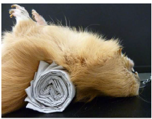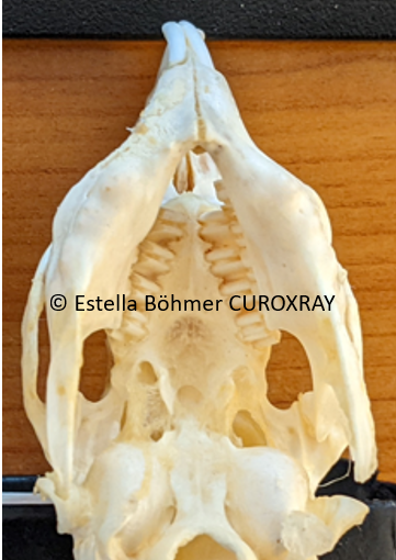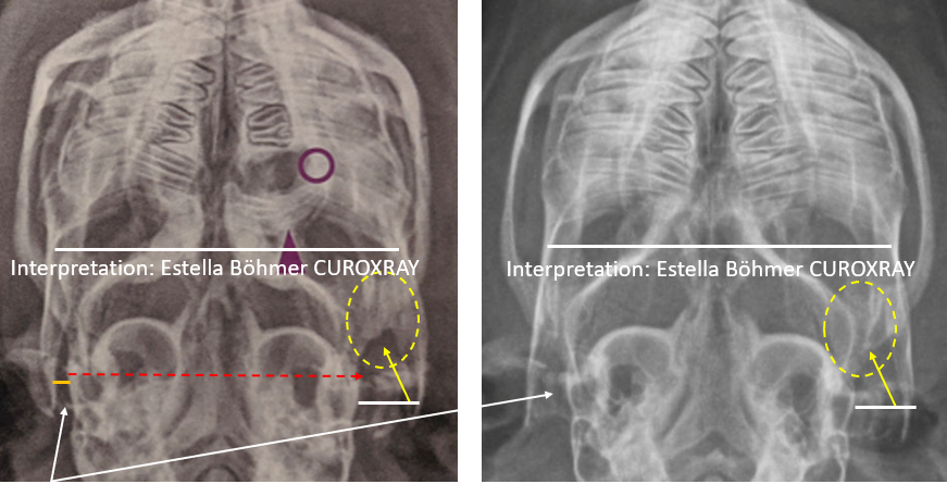 Zum besseren Verständnis hier ein Vergleich mit einer identisch (leicht asymmetrisch) gelagerten Aufnahme eines anderen Vergleichs-Meerschweinchens: auch hier ist der kaudale Unterkieferast dezent nach lateral verlagert (gelber Kreis rechtes Bild). Das ist lagerungsbedingt. Hinzu kommt aber, dass es weniger ausgeprägt ist (rechte weiße Linie) und dass sich die knöchernen Strukturen des Kiefergelenkes bei diesem Vergleichstier insgesamt radiologisch gesehen ruhiger darstellen (gelbe Pfeile). Im Gegensatz hierzu erscheinen sie beim im Poster dargestellten Patienten (linkes Bild) weniger deutlich abgegrenzt, im Sinne einer Arthrose oder ev. Infektion (gelber Kreis linkes Bild). Weitere diagnostische Schritte sind erforderlich, um dies sicher zu klären.