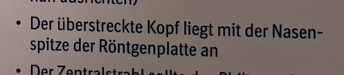 Im Zusammenhang mit der Lagerung verstehe ich auch die hier gegebene Empfehlung nicht, Augen und Ohren möglichst plattennah auszurichten? Wenn der Kopf, wie es für diese Aufnahmetechnik erforderlich ist, relativ steil nach unten hängt, dann sind die Ohren und die Augen ja relativ weit von der Tischplatte entfernt. Anders geht es ja gar nicht. Dass sie unten sind ist selbstverständlich, da der Patient in Rückenlage ist.