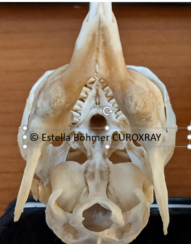 Warum sollte man hierbei den Fang öffnen müssen? Denn hierdurch wird das mit dieser speziellen Technik gewünschte Herausprojezieren der oberen Backenzähne zum Großteil neutralisiert. Das kann man selbst erkennen, wenn man einfach ein Kopfpräparat in der hierfür erforderlichen Lagerung mit dem Kopf steil (!) nach unten betrachtet: Man erkennt bei dieser steilen Lagerung des Kopfes, bei der man nun direkt auf die inneren Bereiche der Maxilla blicken kann (sozusagen dem Verlauf des Zentrahlstrahls entsprechend) eine recht gute Darstellung der maxillären Backenzähne. Der Fang ist hierbei geschlossen !!! Öffnet man jedoch den Mund, wie es der Autor des Beitrages empfiehlt/beschreibt, so überdeckt nun die Mandibula einen Großteil der oberen Backenzähne, da sie weiter nach kaudal über die Maxilla positioniert wird. Das ist bei der isolierten Darstellung der Maxilla nicht gewollt, kontraproduktiv und absolut nicht sinnvoll. Falls der Autor jedoch darin Vorteile sieht, so könnte man diese modifizierte Lagerung als „Oberkiefer isoliert mit geöffnetem Fang nach Fehr“ nennen. Der Sinn einer solchen veränderten Lagerung erschließt sich mir nur leider nicht. Daher empfehle ich die originale Version zur Positionierung mit geschlossenem Fang = „Oberkiefer isoliert nach Böhmer“. Das macht für mich mehr Sinn. Hinzu kommt der Vorteil, dass diese Aufnahme bei ruhigen Patienten durchaus ohne (!) Narkose oder Sedation angefertigt werden kann, wohingegen die „open mouth“ Technik nur beim narkotisierten Patienten in Frage kommt. Somit meines Erachtens ein weiterer Vorteil der originalen Version.