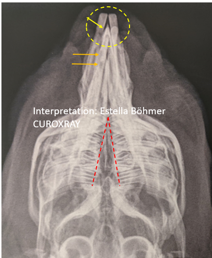 Betrachten wir das Bild mit der Positionierung des Patienten, so fällt auf, dass der Kopf des Tieres trotz Unterlegung des Nackens mit einer Zellstoffrolle recht horizontal liegt. Die gelbe Linie markiert in etwa den Verlauf der Mandibula (deren ventraler Rand) und die gestrichelte Linie den der Maxilla (Nasenrücken). Beide Linien verlaufen ziemlich parallel. Um eine gute Aufnahme „Oberkiefer isoliert“ hinzubekommen, sollte der Kopf aber ca. 40 Grad, also relativ steil, nach unten hängen. Das ist hier definitiv nicht der Fall. Obwohl der Autor im Text schreibt, dass „der überstreckte Kopf mit der Nasenspitze (!) der Röntgenplatte anliegt“ ???!!! Ein deutlicher Widerspruch. Mit dieser Lagerung kann man den Oberkiefer jedenfalls nicht isoliert darstellen. Was vielleicht dann für den einen oder anderen Kollegen, -in, der/die es versucht, frustrierend sein könnte.