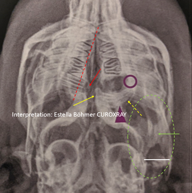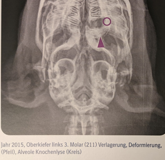 In der Bildbeschreibung werden lediglich die Zahnveränderungen und die Knochenlyse beschrieben, wobei der lila Kreis aber eigentlich nicht darauf hinweist. Nicht erwähnt werden die höchstgradige strukturelle Veränderung des betroffenen Backenzahnes (M3) bis in den apikalen Bereich hinein, einhergehend mit einer ausgeprägten apikalen Elongation (gelber Pfeil) sowie einer vor allem kaudal erkennbaren entzündlichen Zahnfacherweiterung (gelber gestrichelter Pfeil). Ebenso ignoriert werden die ausgeprägte apikale Elongation des M3 im rechten Oberkiefer (roter Pfeil und rote gestrichelte Linie) und eine vermutlich vorliegende Veränderung des linken Kiefergelenkbereiches (grüner gestrichelter Kreis). Der kaudale Unterkieferast liegt linksseitig viel weiter entfernt von der lateralen Wand der Bulla tympanica als auf der Gegenseite – dabei durchaus berücksichtigend, dass die Aufnahme nicht absolut symmetrisch gelagert ist. Eine Ausbreitung lokaler Infektionen vom M3 zum nahegelegenen Kiefergelenk oder der Orbita sind häufige Komplikationen. Da Pathologien des Kiefergelenkes prognostisch meist infaust sind, müssen sie Erwähnung finden. Am Besten mit einem Hinweis, wie man nun weiter vorgehen kann/soll. Die Veränderungen nicht zu erwähnen, könnte dazu verleiten den betroffenen Zahn jetzt einfach zu ziehen und eine Heilung zu erwarten, die aber unter Umständen so nicht erwartet werden kann. Komplikationen und ein fatales Ende können hierdurch vorprogrammiert werden.