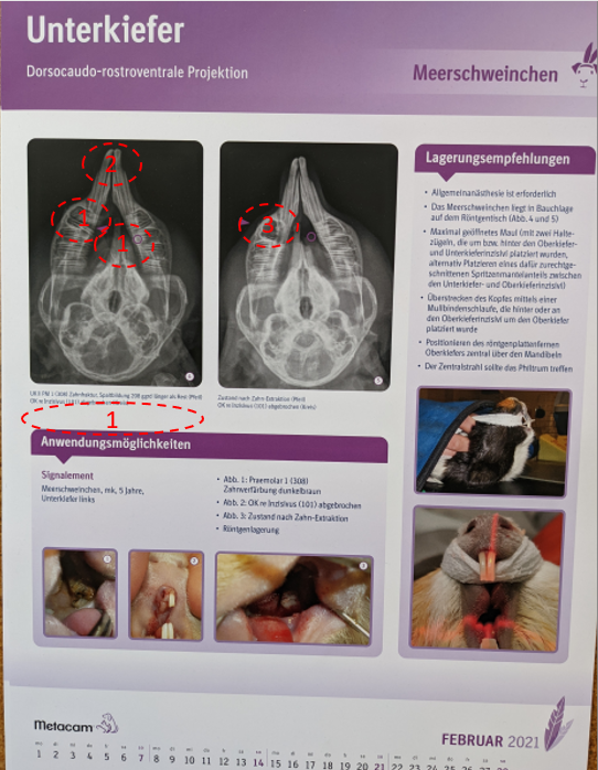 Auf dem Kalenderblatt des Monats Februar 2021 wird ein Meerschweinchen vorgestellt, das einseitig einen pathologisch veränderten ersten mandibulären Backenzahn (P4) aufweist.