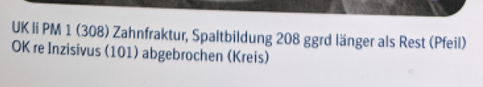 Desweiteren ist mir die Beschreibung „Spaltbildung 208 ggrd länger als Rest (Pfeil)“ nicht verständlich. 208 ist nach dem Triadansystem der erste linke maxilläre Backenzahn (P4). Dieser ist bei der gezeigten Lagerung eigentlich nicht erkennbar (gelber Pfeil) und der erwähnte lila Pfeil weist ja eigentlich auch nicht darauf hin, sondern auf den veränderten mandibulären Backenzahn?