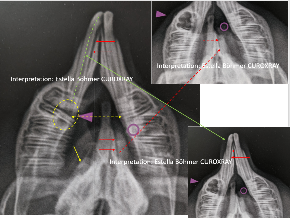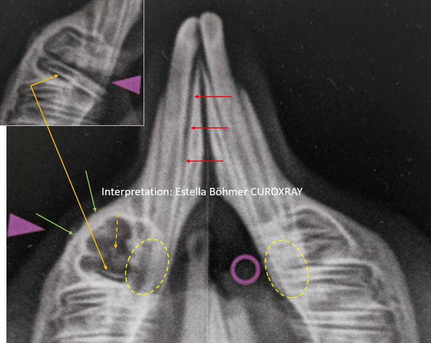 Gezeigt wird eine mehr oder weniger symmetrisch gelagerte Unterkiefer isoliert Aufnahme nach Böhmer (siehe Beitrag vom 9-4-2022), die einen längsgespaltenen ersten mandibulären Backenzahn (P4) zeigt (dicker lila Pfeil des Autors). Der Autor bezeichnet dies irrtümlicherweise (?) oder bewusst (?) als „Zahnfraktur“. Eine Fraktur ist in aller Regel die Folge eines Traumas oder eines Ermüdungsbruches bei normaler Belastung. Dies ist bei diesen typischen Längsspaltungen der Backenzähne von Heimtieren jedoch nicht der Fall. Es handelt sich gewissermaßen um eine Separation der jeweiligen Dentinsäulen als Folge der apikalen Entzündung.